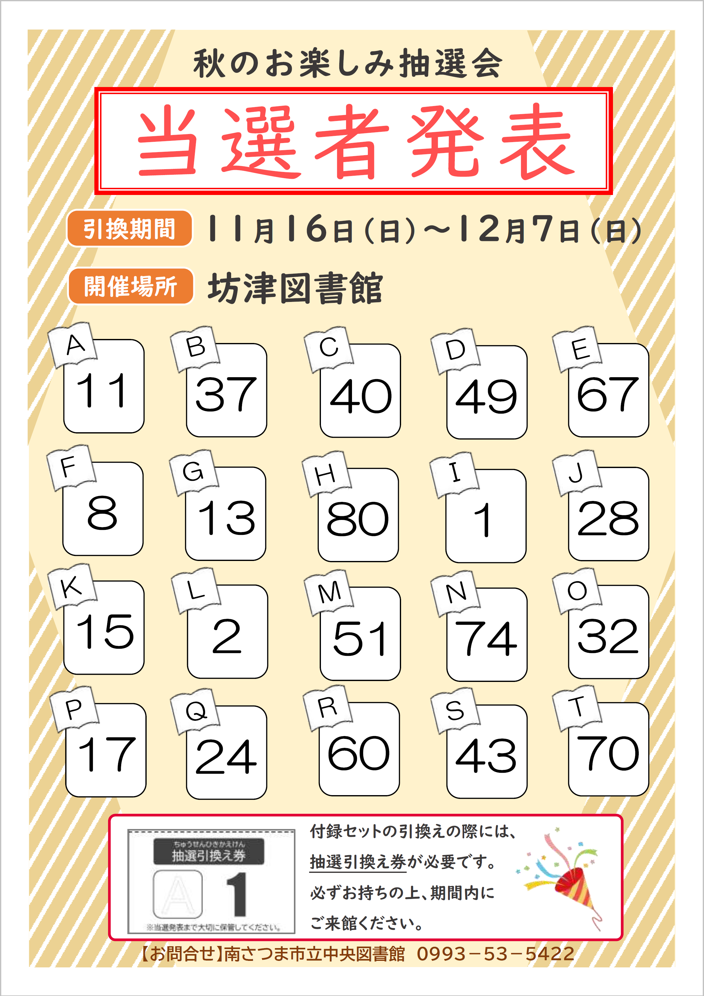 抽選の結果、当選者は以下のとおりです。引換期間中に坊津図書館で景品をお受け取りください。