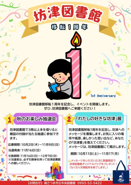 坊津図書館移転1周年を記念し、坊津へのメッセージを募集します。お気に入りの場所や風景、楽しかった思い出など、あなたの「坊津愛」を教えてください。メッセージは、坊津図書館にて掲示します。