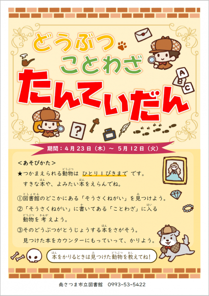 ことわざに出てくる動物たちが、図書館にかくれているよ。