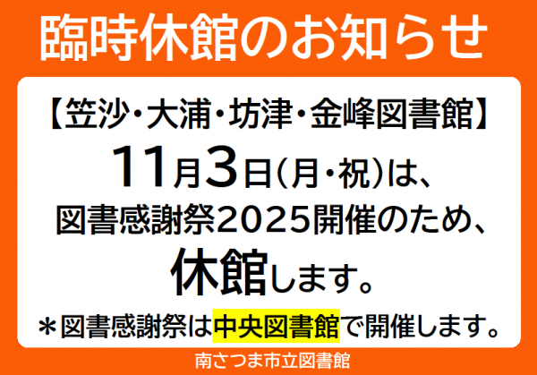 11月3日(月・祝)は、図書感謝祭2025開催のため、 笠沙・大浦・坊津・金峰図書館は臨時休館します。 本の返却は、各館備え付けの返却箱をご利用ください。