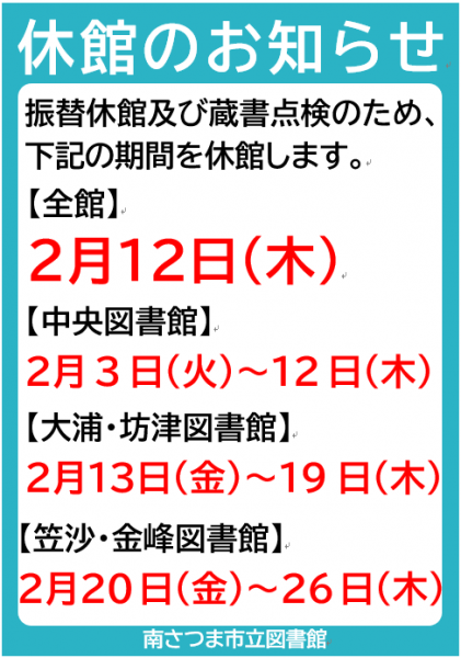 振替休館及び蔵書点検のため、下記の期間休館します。