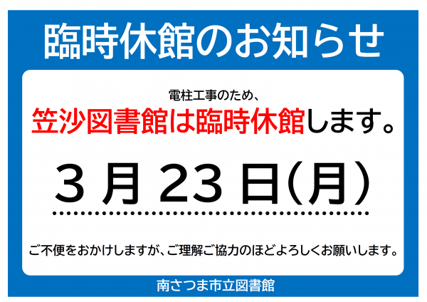 3月23日(月)は電柱工事のため、笠沙図書館は臨時休館となります。 ご不便をおかけしますが、ご理解ご協力のほどよろしくお願いします。