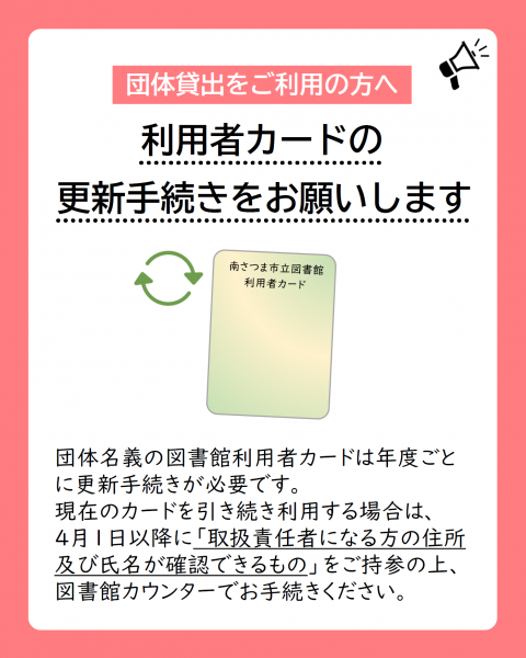 団体名義の図書館利用者カードは年度ごとに更新手続きが必要です。 現在のカードを引き続き利用する場合は、4月1日以降に「取扱責任者になる方の住所及び氏名が確認できるもの」をご持参の上、図書館カウンターでお手続きください。