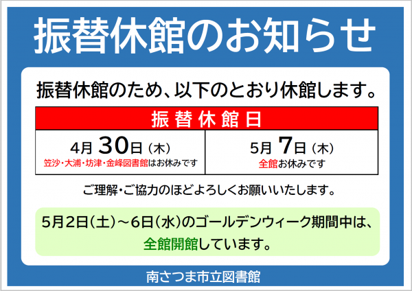 振替休館のため、以下とおり休館します。 休館中の返却は、各館備え付けの返却箱をご利用ください。 <振替休館日> 4月30日(木):笠沙・大浦・坊津・金峰図書館はお休みです。 5月7日(木):全館お休みです。